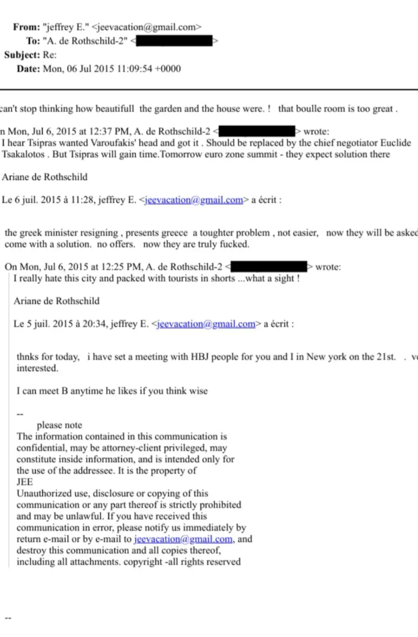 Σε email που αντάλλασε με την Αριάν ντε Ρότσιλντ, διευθύνουσα Σύμβουλο του χρηματοπιστωτικού ομίλου Edmond de Rothschild Group αναφέρονται στην παραίτηση του Γιάνη Βαρουφάκη από τη θέση του υπουργού Οικονομικών.