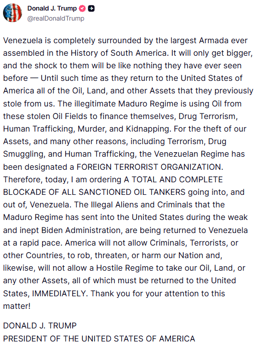 Με ανάρτησή του στο Truth Social, ο Αμερικανός πρόεδρος ανακοίνωσε ότι διέταξε τον πλήρη και απόλυτο αποκλεισμό όλων των πετρελαιοφόρων δεξαμενόπλοιων που τελούν υπό αμερικανικές κυρώσεις και κατευθύνονται προς ή αποπλέουν από τη Βενεζουέλα. Όπως υποστήριξε, η απόφαση συνδέεται με την «κλοπή αμερικανικών πόρων», αλλά και με λόγους που, κατά τον ίδιο, αφορούν την τρομοκρατία, το λαθρεμπόριο ναρκωτικών και την εμπορία ανθρώπων.