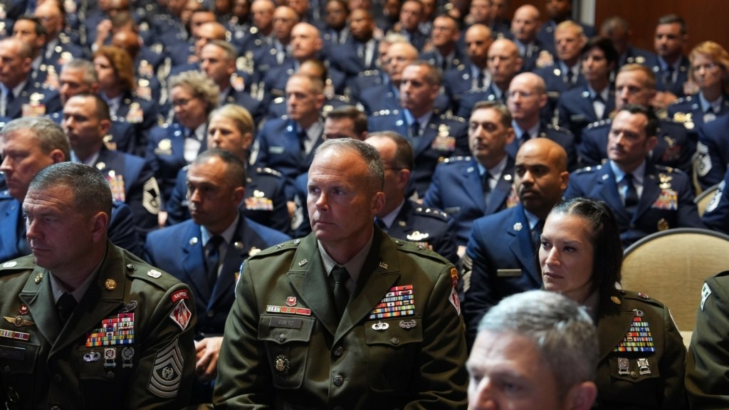 Το αμφιθέατρο γεμάτο με ανώτατους ένστολους αξιωματούχους, καθισμένους μπροστά σε μια σκηνή με μια μεγάλη αμερικανική σημαία, ένα αναλόγιο και πινακίδες που έγραφαν: «Strength Service America».