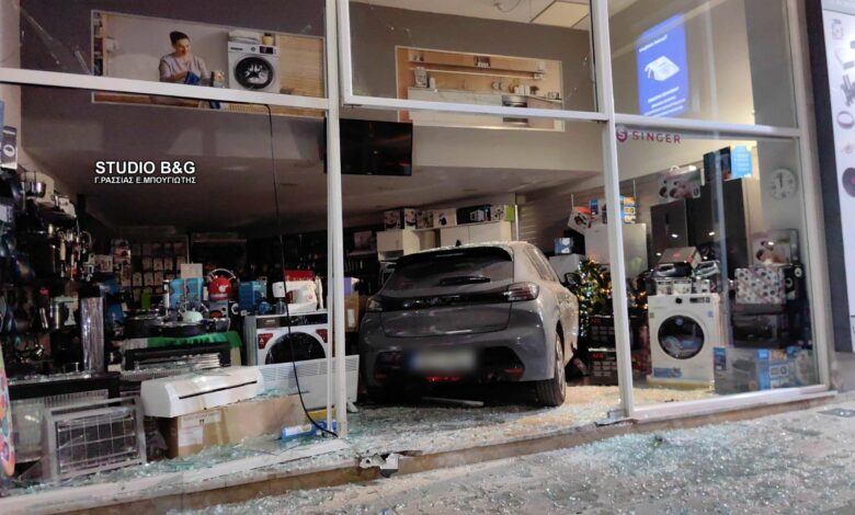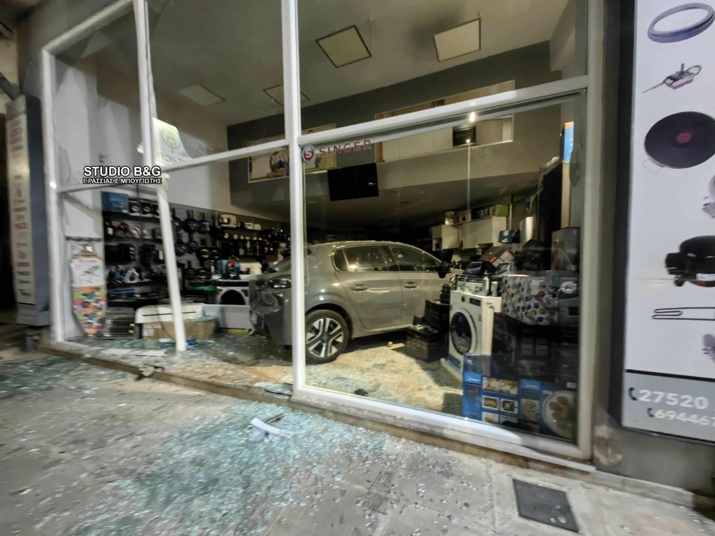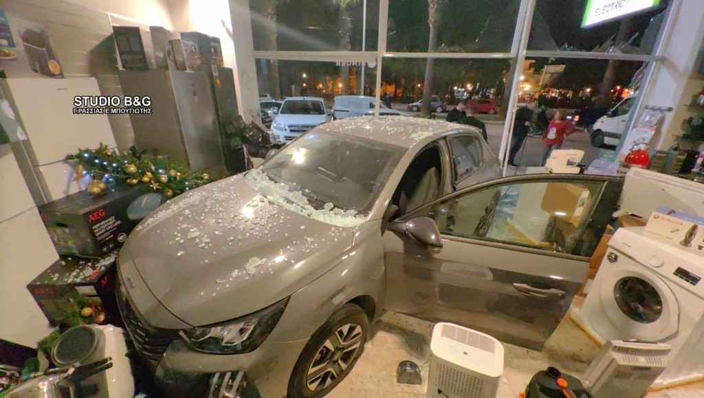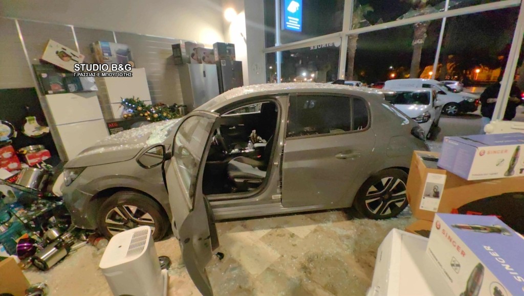 Τρελή πορεία αυτοκινήτου στο Ναύπλιο – «Μπούκαρε» σε κατάστημα ηλεκτρικών ειδών (photos/video)
