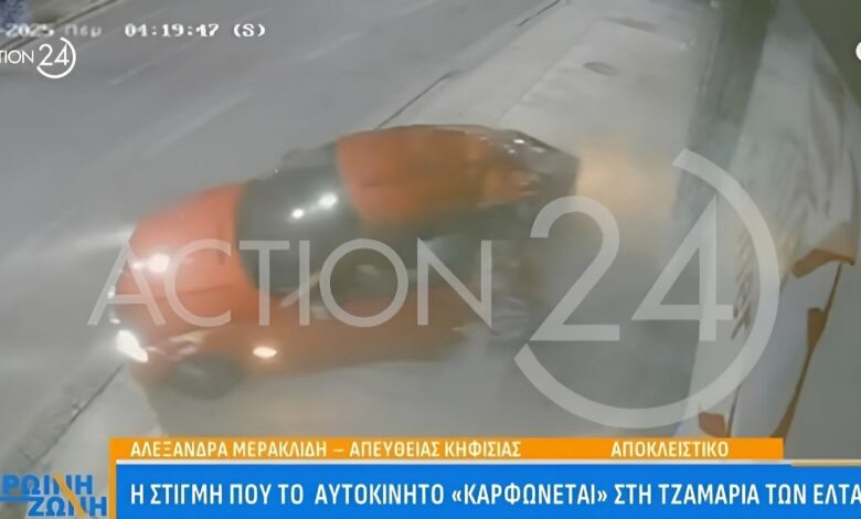 Σε βίντεο από κάμερα ασφαλείας που προυσίασε το Action24, αποτυπώνεται η κατάληξη της τρελής πορείας του αυτοκινήτου και οι ζημιές που προκλήθηκαν.