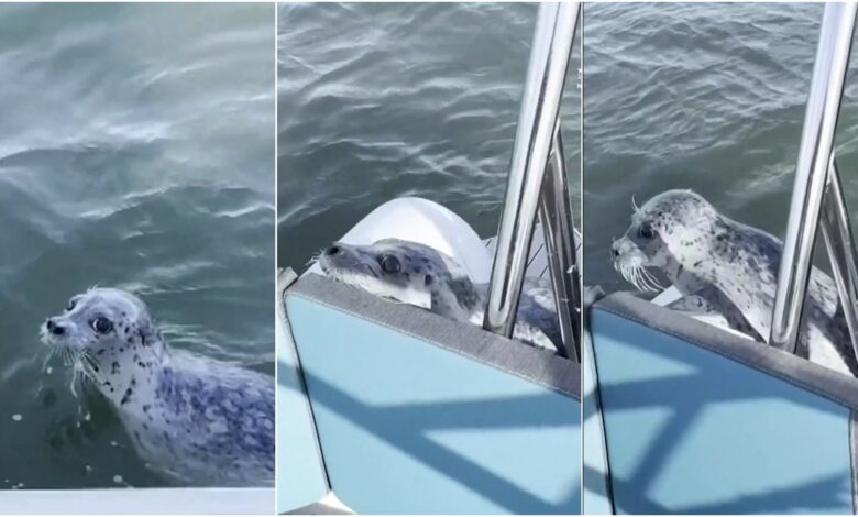 Η φώκια κατάφερε να βγει από το νερό και να σκαρφαλώσει στη μικρή πλατφόρμα στο πίσω μέρος του σκάφους, κοντά στη μηχανή — ουσιαστικά ψάχνοντας για καταφύγιο.