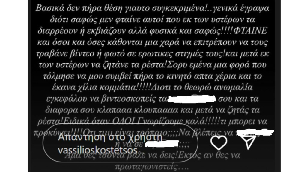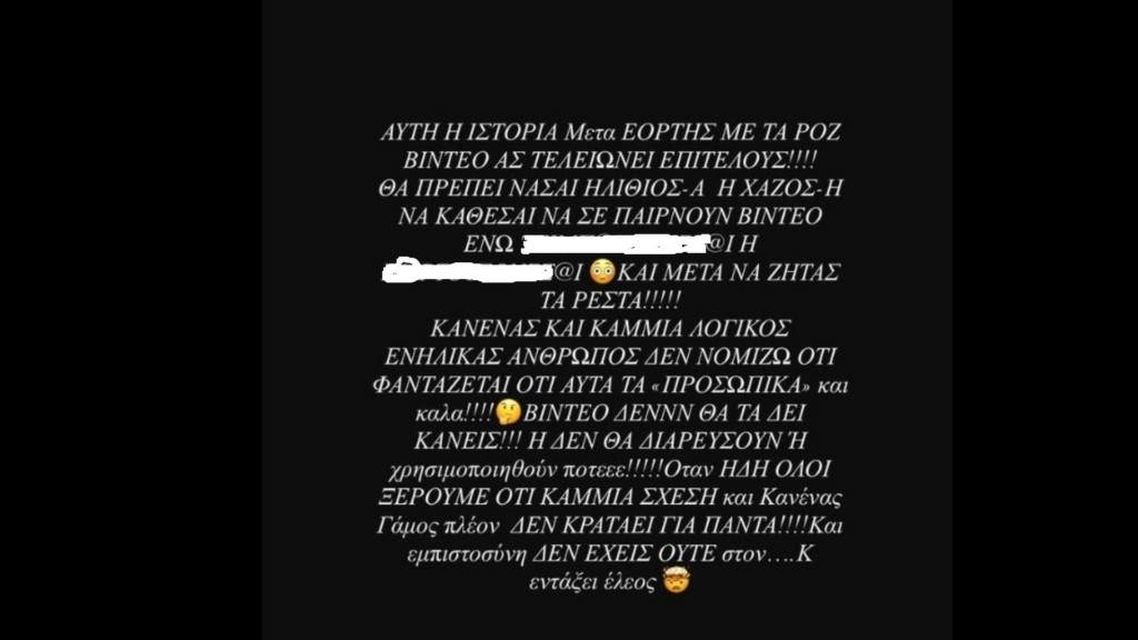 «Αυτή η ιστορία μετά εορτής με τα ροζ βίντεο ας τελειώσει επιτέλους! Θα πρέπει να είσαι ηλίθιος ή χαζός – χαζή να κάθεσαι να σε παίρνουν βίντεο ενώ τσ…@@σαι ή πα@@@σαι και μετά να ζητάς τα ρέστα! Κανένας και καμία λογικός ενήλικας άνθρωπος δεν νομίζω ότι φαντάζεται πως αυτά τα “προσωπικά” και καλά βίντεο δεν θα τα δει κανείς ή δεν θα διαρρεύσουν ή δεν θα χρησιμοποιηθούν ποτέ! Όταν ήδη όλοι ξέρουμε ότι καμία σχέση και κανένας γάμος πλέον δεν κρατάει για πάντα! Και εμπιστοσύνη δεν έχεις ούτε στον… Κι εντάξει έλεος!» έγραψε.