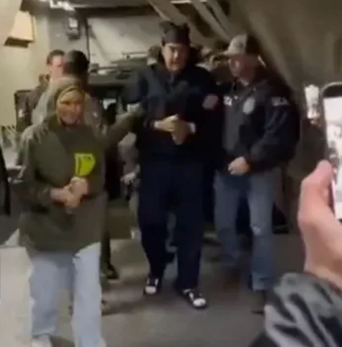 Οι φωτογραφίες δείχνουν τη Φλόρες τυλιγμένη με ένα φούτερ με κουκούλα, με τα χέρια της σφιχτά ενωμένα μπροστά στο στήθος της, ενώ ένοπλοι πράκτορες την περιέβαλλαν στον διάδρομο προσγείωσης.