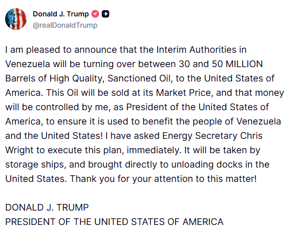 «Έχω την ικανοποίηση να ανακοινώσω ότι οι προσωρινές αρχές της Βενεζουέλας θα παραδώσουν στις ΗΠΑ από 30 ως 50 εκατομμύρια βαρέλια πετρελαίου υψηλής ποιότητας που υφίσταται κυρώσεις», ανέφερε ο Αμερικανός πρόεδρος μέσω Truth Social. Όπως πρόσθεσε, «το πετρέλαιο αυτό θα πωληθεί σε τιμές της αγοράς και τα χρήματα θα ελεγχθούν από εμένα, τον πρόεδρο των ΗΠΑ, ώστε να χρησιμοποιηθούν προς όφελος του λαού της Βενεζουέλας και των ΗΠΑ».