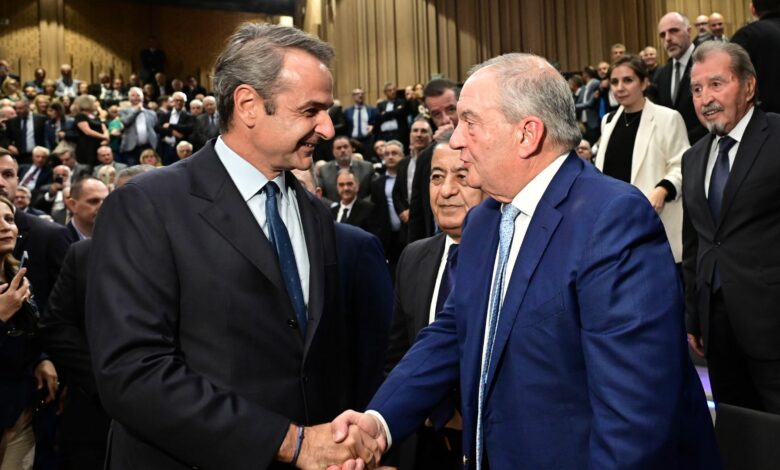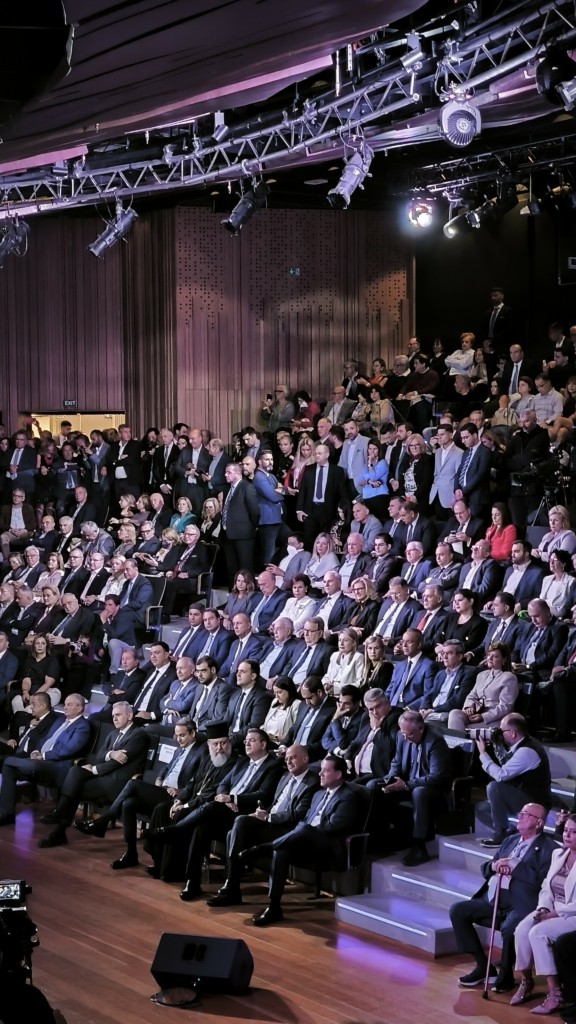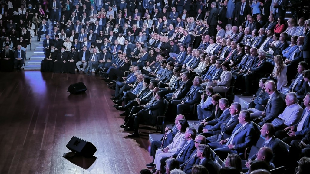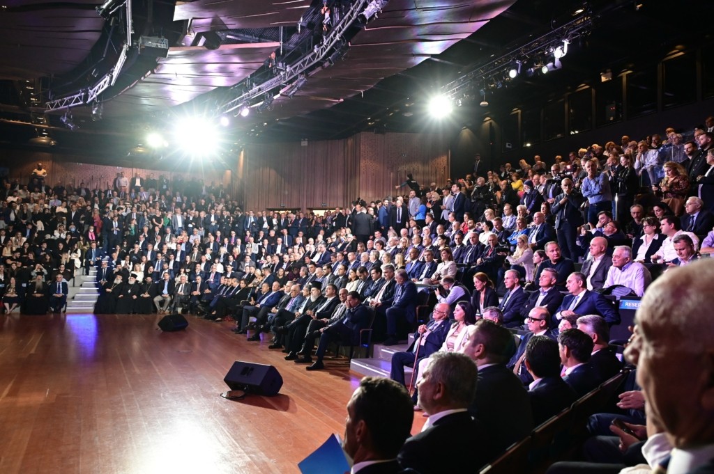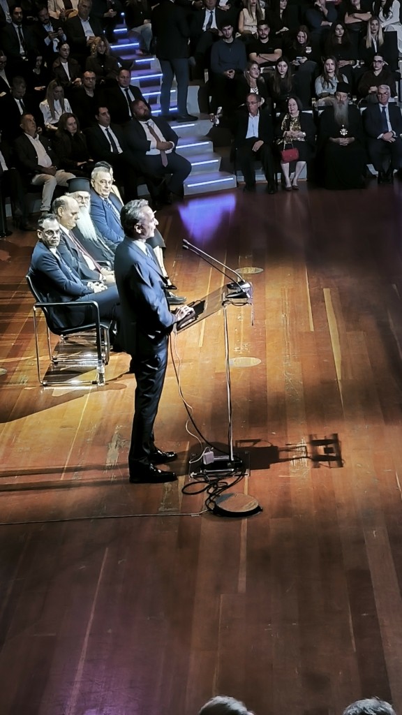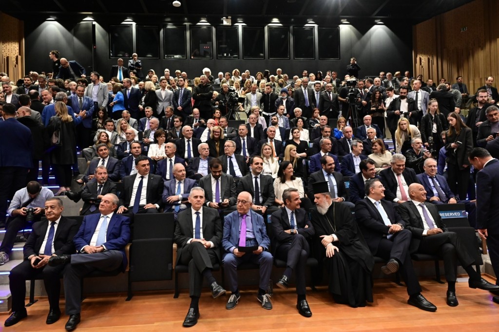 Με χειροκροτήματα έγινε δεκτός στην αίθουσα του Ωδείου Αθηνών ο πρωθυπουργός Κυριάκος Μητσοτάκης, ενώ λίγο νωρίτερα, θερμή υποδοχή είχαν επιφυλάξει οι παριστάμενοι και στον πρώην πρωθυπουργό Κώστα Καραμανλή. Οι δύο άνδρες αντάλλαξαν χειραψία.