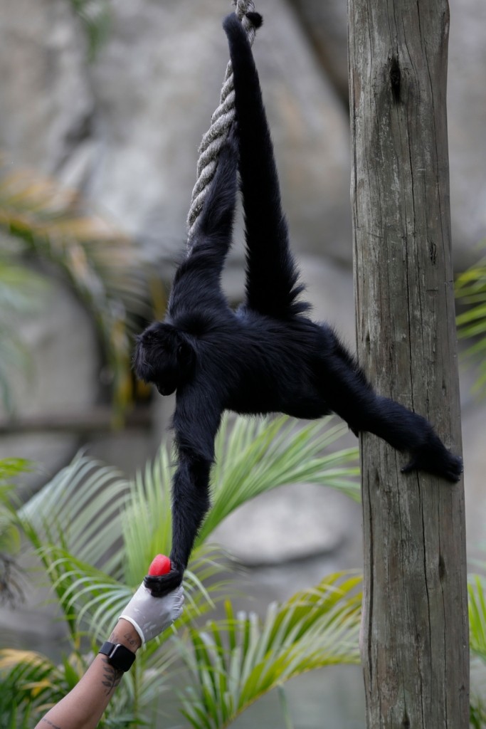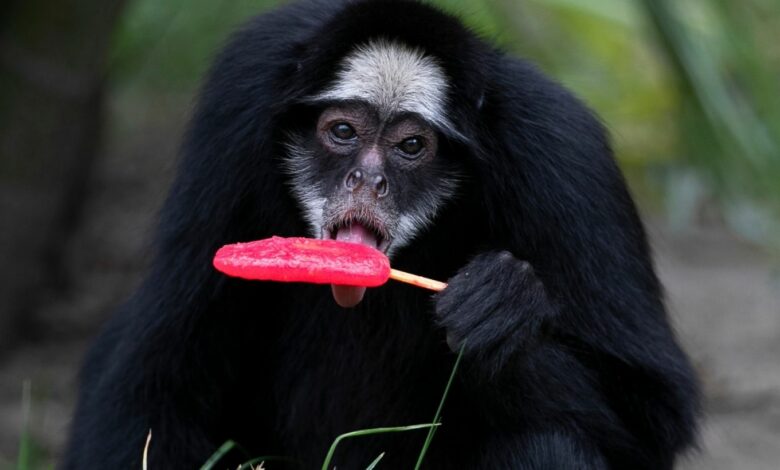 Φροντιστές του ζωολογικού κήπου μοίρασαν παγωτά καρπούζι σε ομάδα πιθήκων, ενώ ένας ιαγουάρος προσπάθησε να «ψαρέψει» παγωμένες λιχουδιές από κιμά κοτόπουλου μέσα από μια λεκάνη που επέπλεε στο νερό της δεξαμενής του.