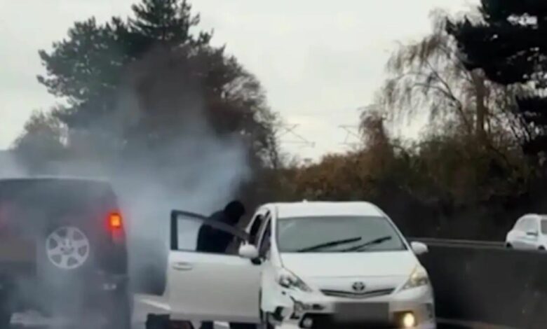 Σκηνές τρόμου εκτυλίχθηκαν σε αυτοκινητόδρομο της Βρετανίας, όταν μια ομάδα κουκουλοφόρων επιτέθηκε και λήστεψε ένα ακινητοποιημένο αυτοκίνητο, προκαλώντας πανικό σε ώρα μάλιστα που πολλά άλλα οχήματα περνούσαν από το σημείο.