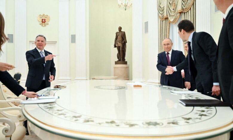 Ο Ρώσος πρόεδρος, Βλαντιμίρ Πούτιν, συνοδεύεται από τους δύο ανώτερους βοηθούς του, τον Κίριλ Ντμίτριεφ και τον Γιούρι Ουσακόφ, καθώς ξεκινά τις συνομιλίες του με τον ειδικό απεσταλμένο του Ντόναλντ Τραμπ, Στιβ Γουίτκοφ, και τον γαμπρό του Τραμπ, Τζάρεντ Κούσνερ.